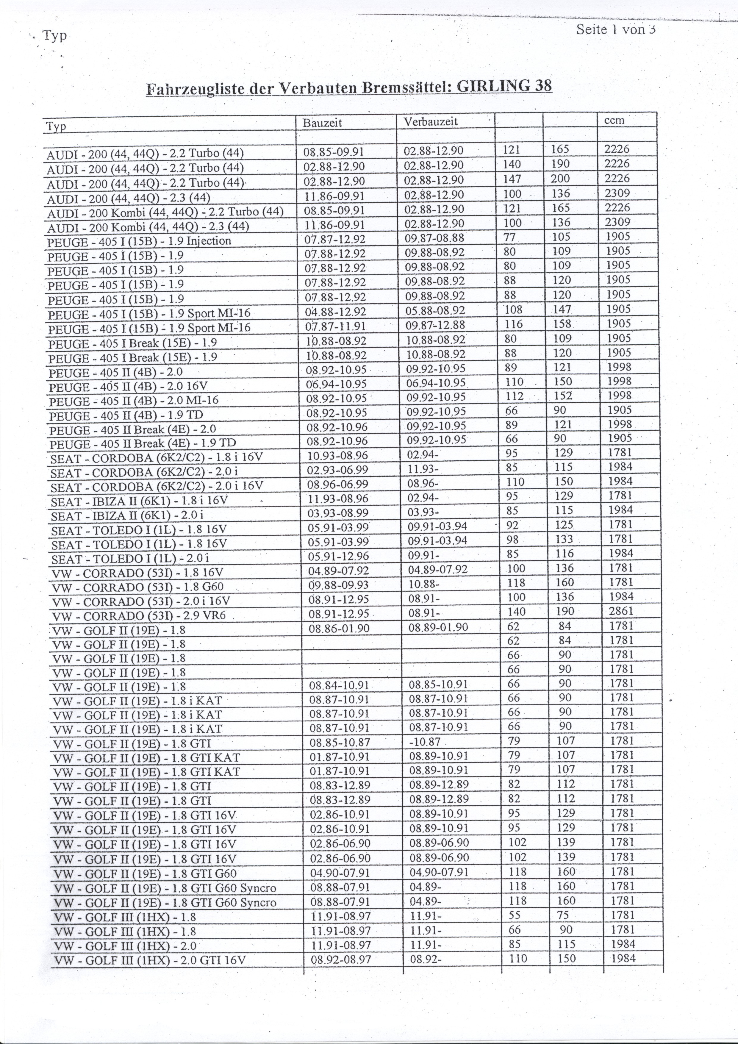 1 Tabelle für die Bremssättel :